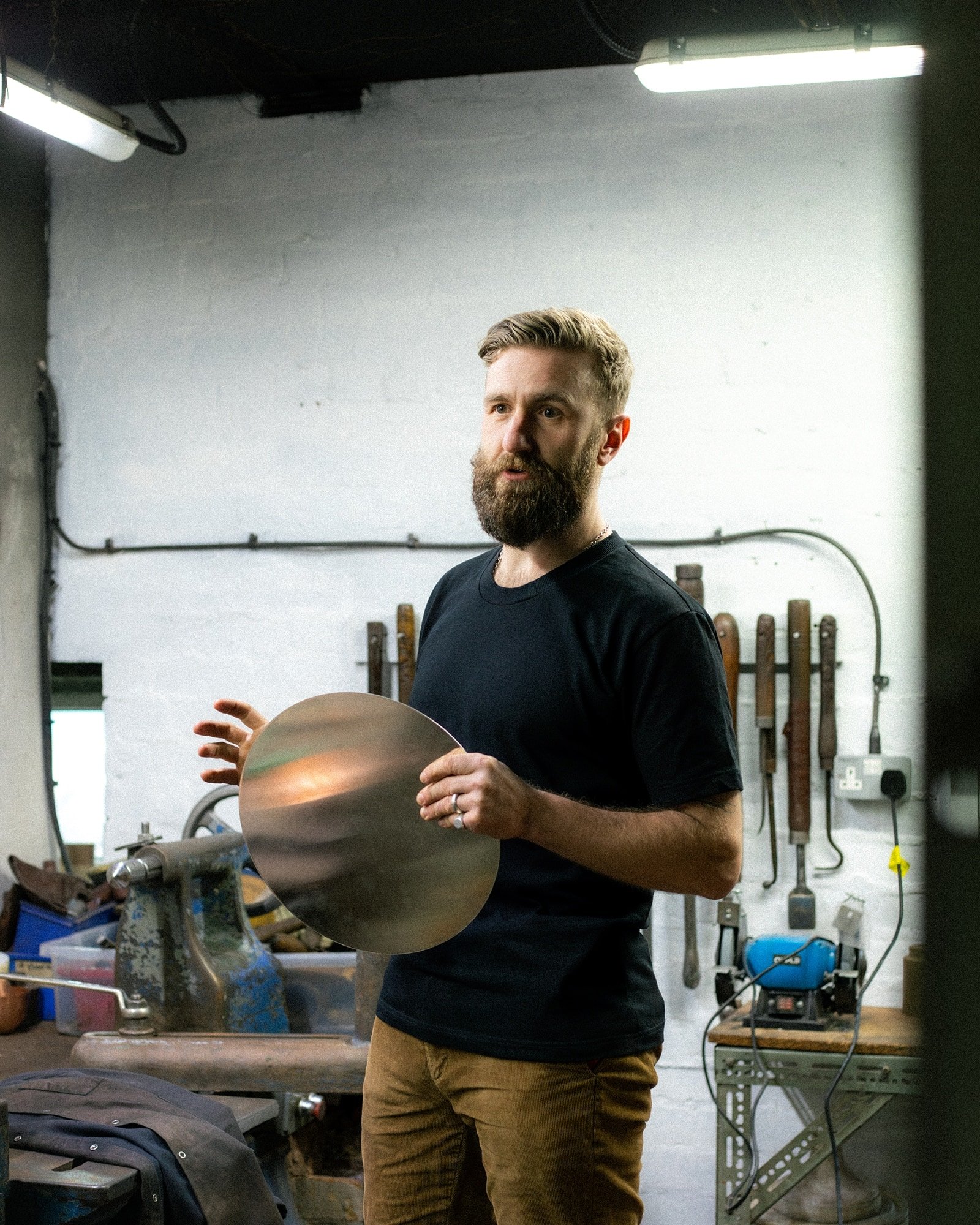 We met him in his workshop, tucked away in an attic in Sheffield’s industrial quarter. Tools of every size and shape cover all of its surfaces, most of them older than any of us in the room, still used to give raw material its form. Watching the work up close offers a rare view not just into the craft of silver spinning, but it begs the question: how might our relationship with the objects around us change if we understood more about the process, and the people behind it?