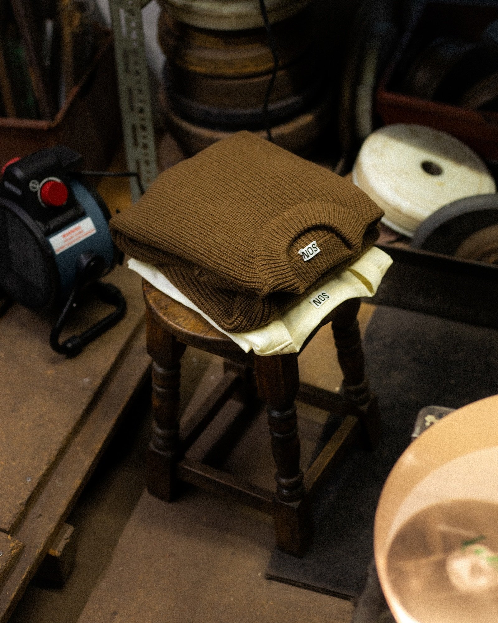 Folded on a stool are the Winter Wool T-Shirt and the Heavy Merino Sweater.