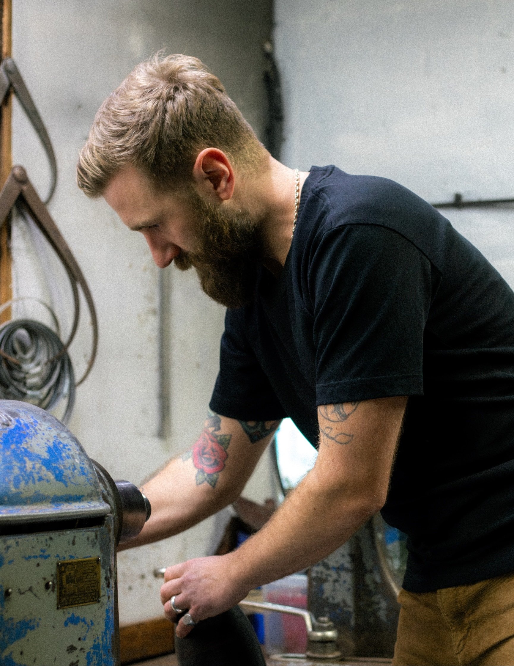 In the workshop, we watch Warren pick up the disc of metal and set it against the lathe. As the lathe spins, he leans in, bracing his body, guiding the metal with steady pressure. The physicality of silver spinning is astounding. A few minutes later, he steps back and holds a small bowl in his hands. In that moment, the object no longer feels separate from the hands that produced it.