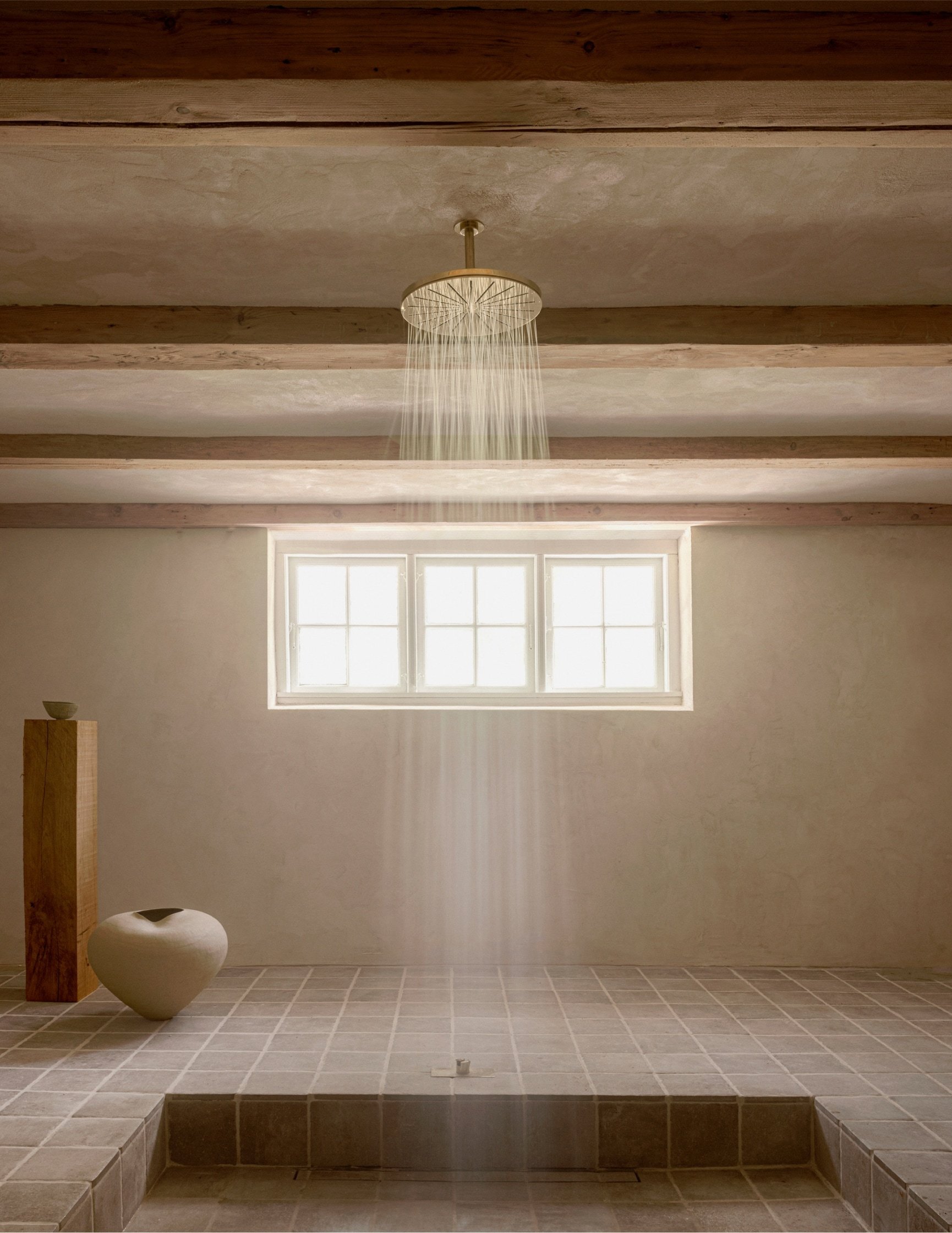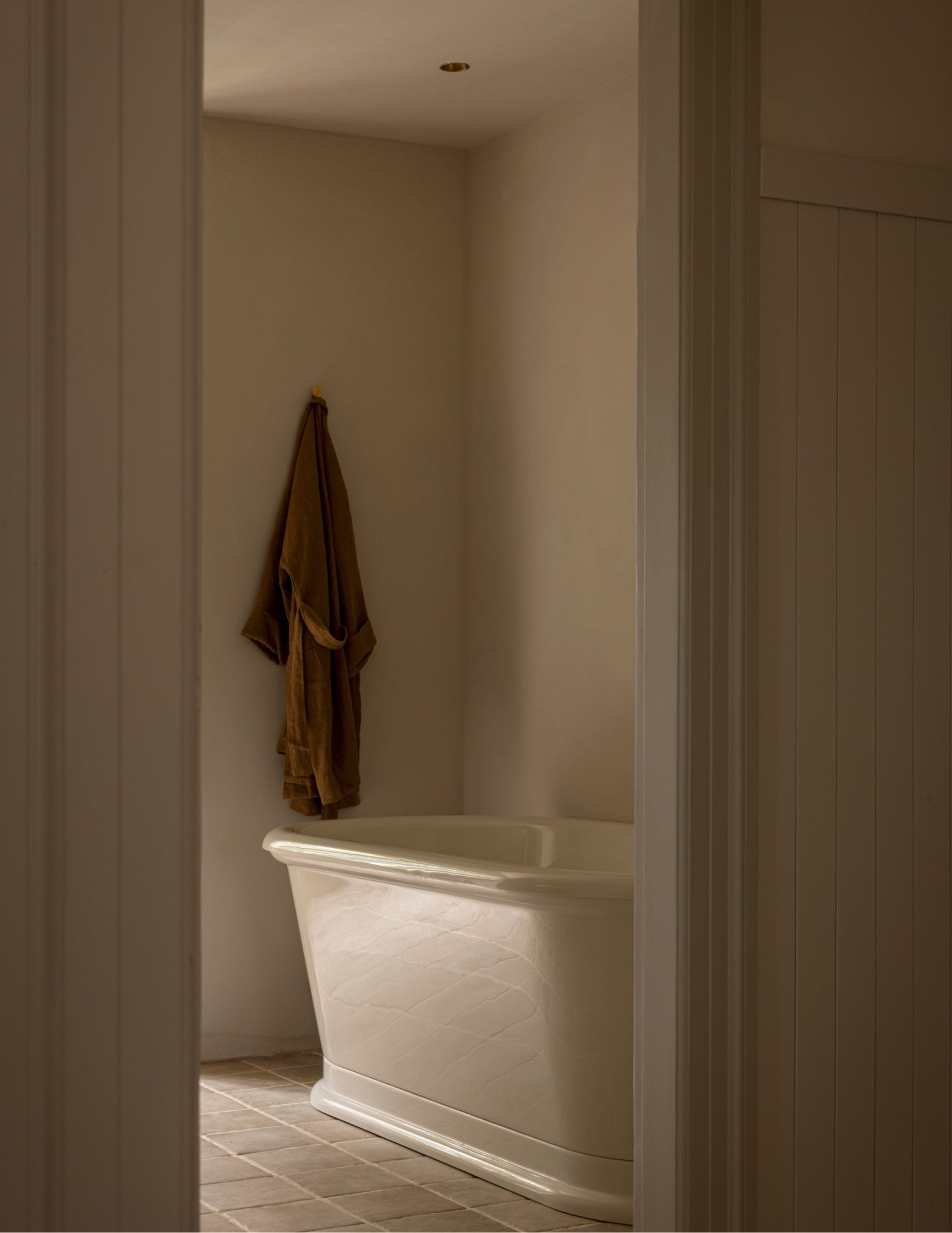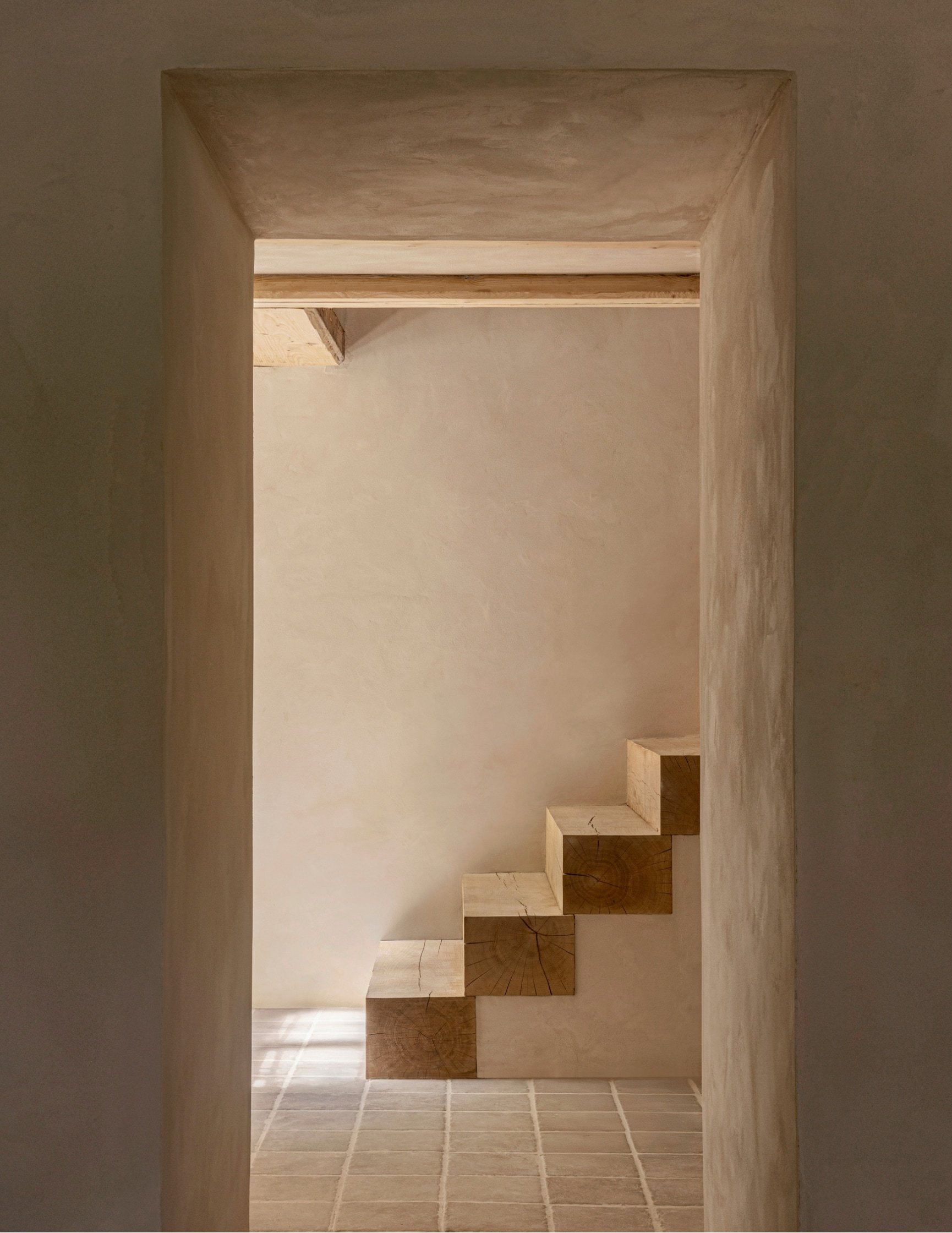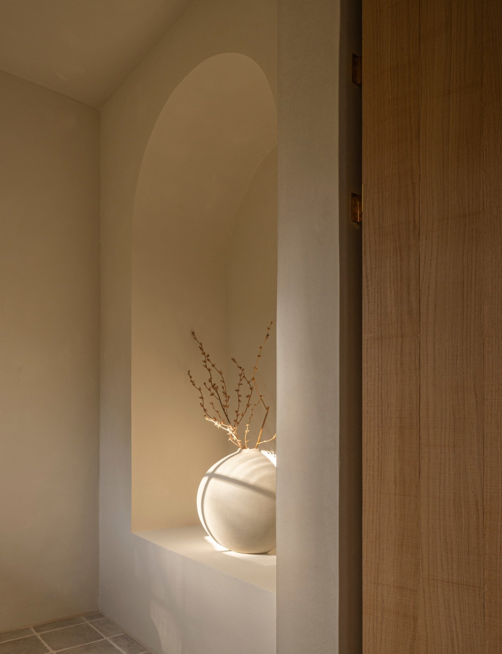 Materials such as lime wash, natural wood, and stone are not simply aesthetic choices, but atmospheric tools. The lime-painted surfaces, for example, absorb and diffuse light in a soft, irregular way, giving walls a sense of depth, naturalness and breathability. Bespoke lighting was designed to avoid harsh contrasts, instead reinforcing the slow, changing rhythm of daylight. Hardware, often overlooked in interiors, was carefully developed to feel tactile and grounded—small points of contact that quietly reinforce the overall experience of quality and care.