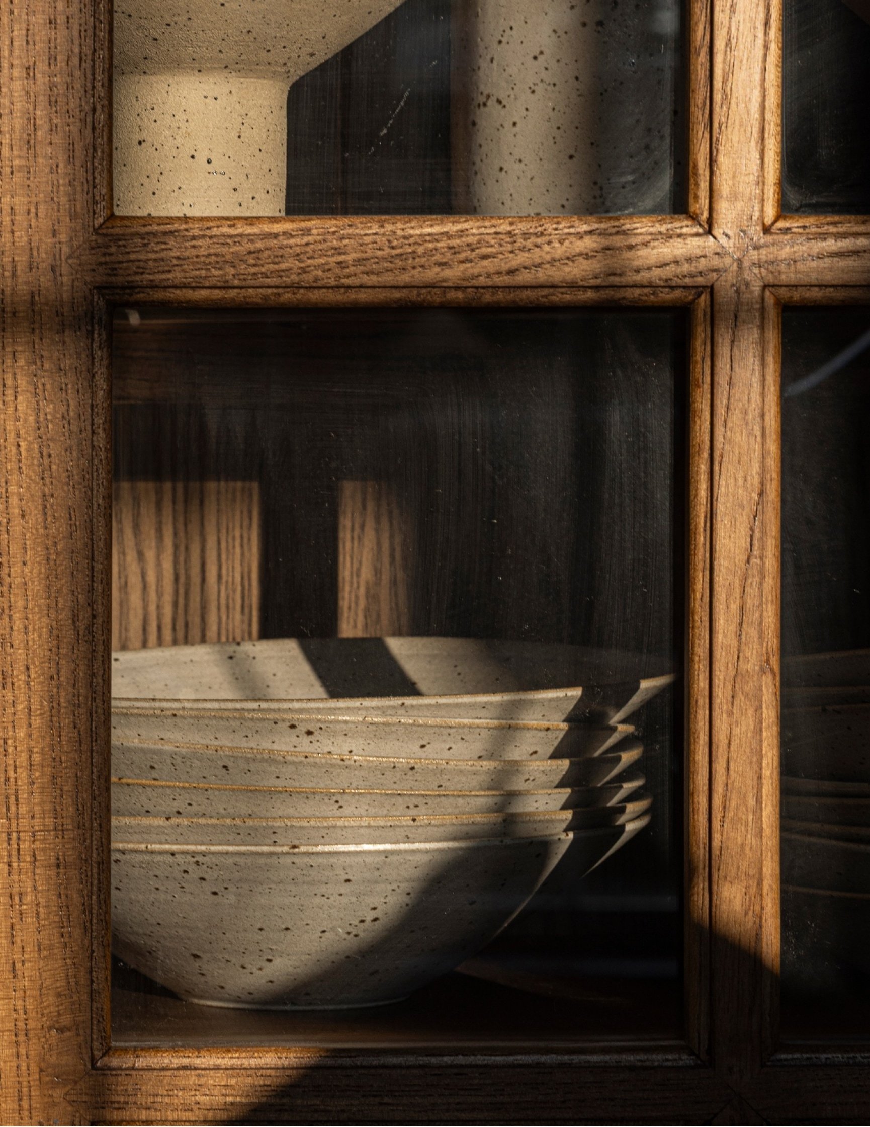 The same logic extends to furniture and objects. Tables, soft seating, shutters, paneling, light, artwork, fabrics and much more were designed in dialogue with the architecture so that the structure of the house and loose interior pieces feel inseparable. Even the dinnerware carries the same ethos—simple, tactile, natural, and rooted in material honesty.